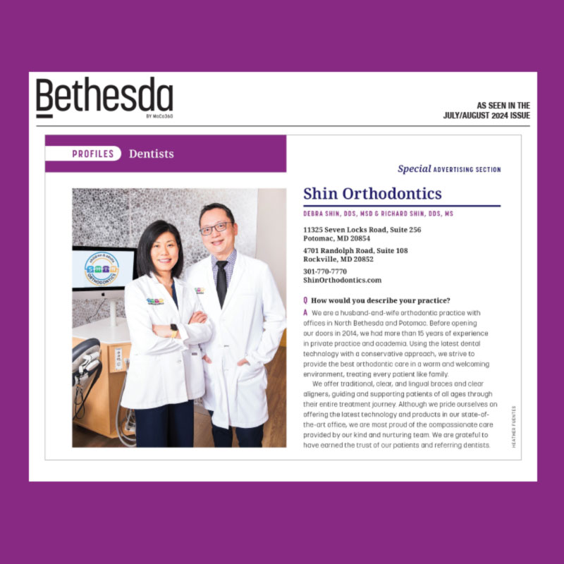 We are thrilled to announce that Shin Orthodontics has been featured in the July/August issue of Bethesda Magazine! This recognition highlights our commitment to providing exceptional orthodontic care to the Bethesda community. We are honored to be showcased in such a prestigious publication and grateful for the continued support from our amazing patients.